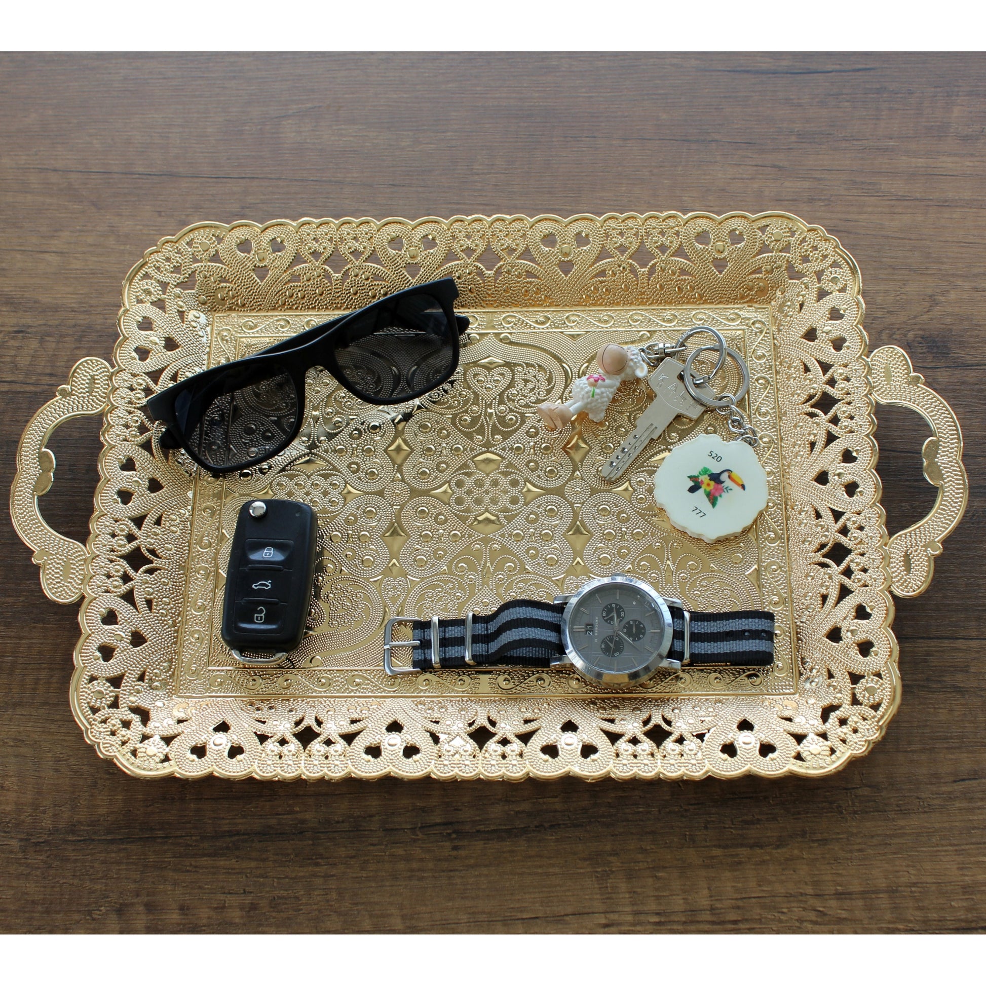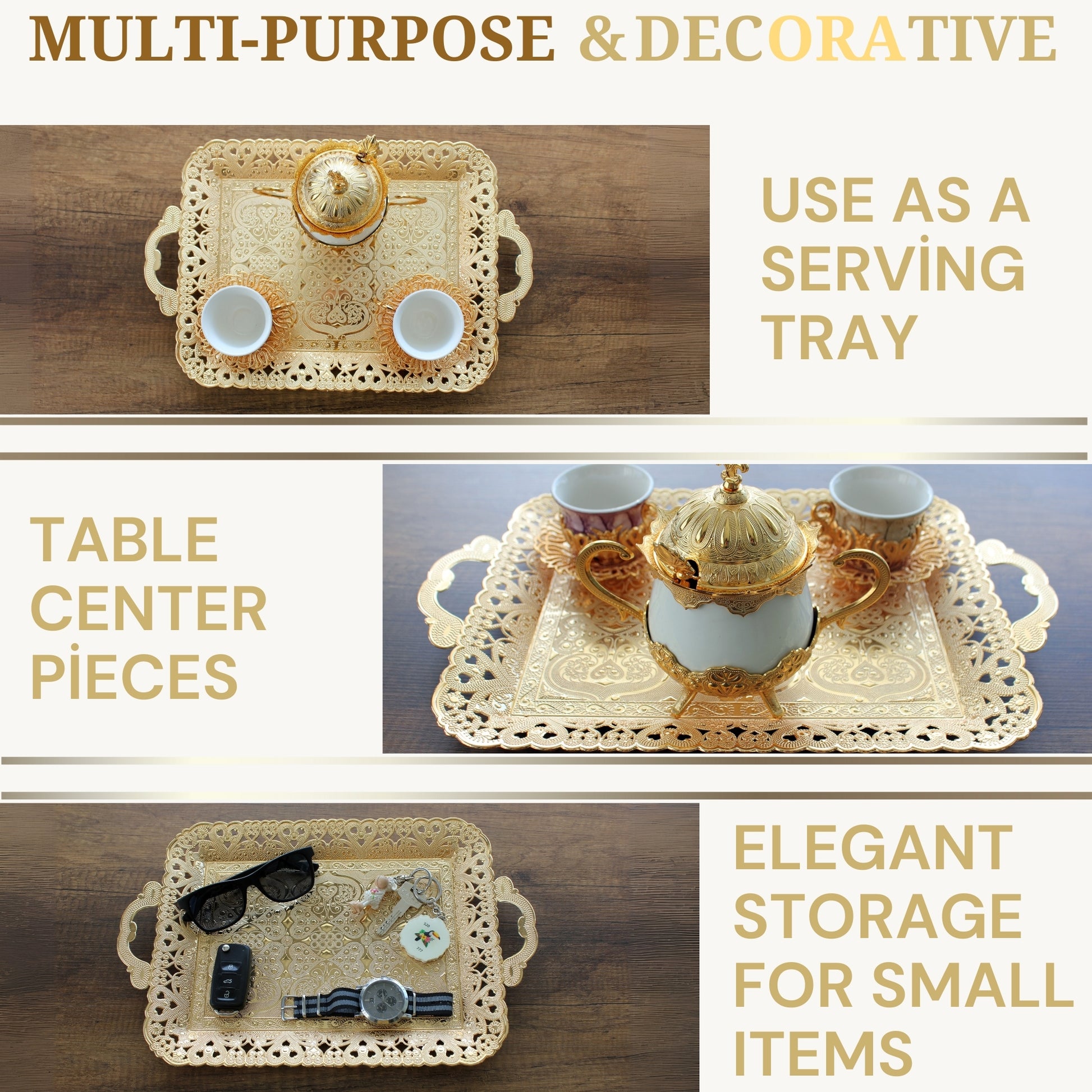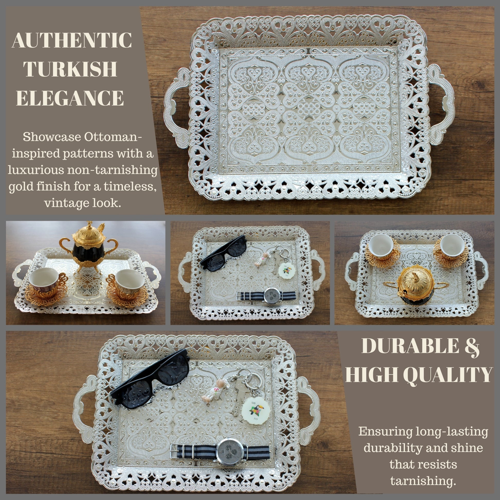 Turkish Vintage Style Entertaining Tray - 16'' x 12'' | Multi-Purpose, Non-Tarnishing, Zamak Alloy, Decorative Ottoman Style - Rectangular Serving Tray for Coffee & Beverages Gold